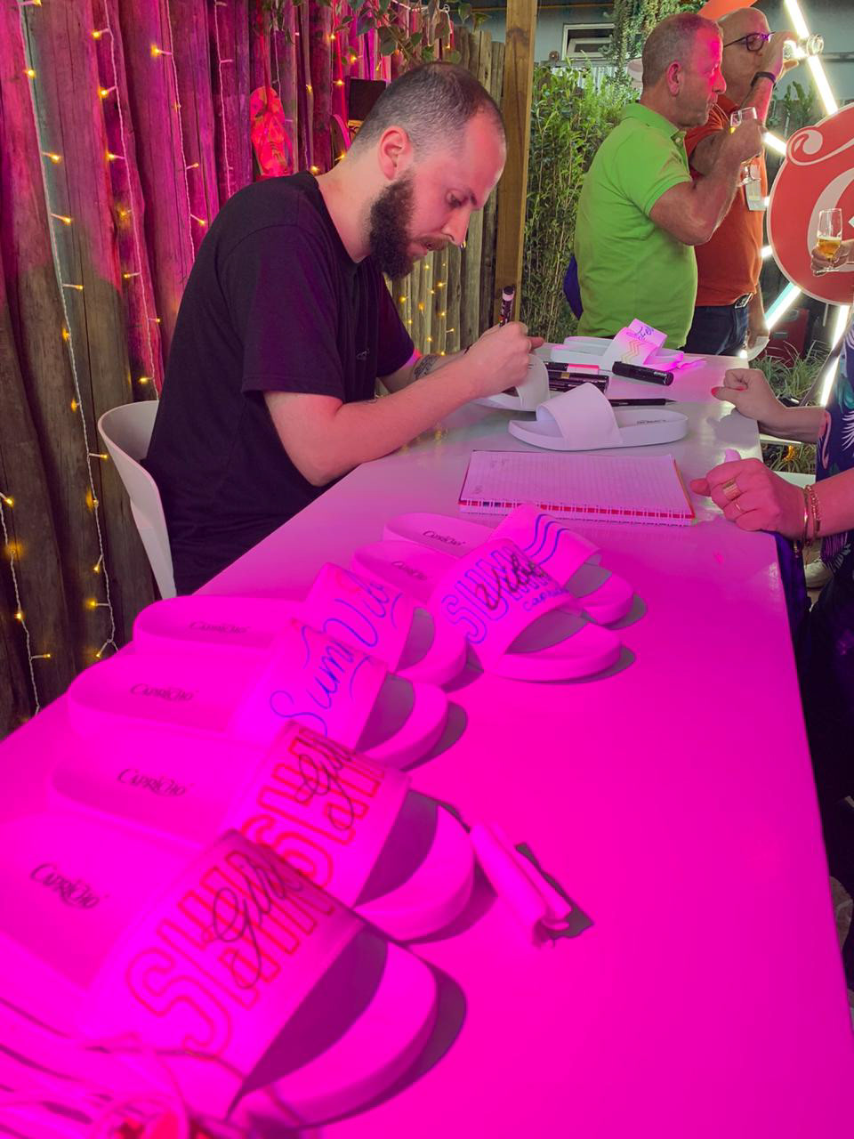 Cada convidado recebeu seu slide e meu objetivo foi personalizar cada um deles de acordo com seus pedidos, colocando um pouco de suas personalidades e sentimentos diretamente nos calçados.